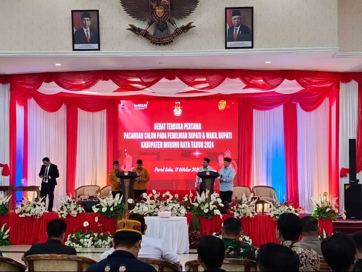 PURUK CAHU, onlinekoranbarito. com – Komisi Pemilihan Umum (KPU) Kabupaten Murung Raya menggelar debat terbuka untuk pasangan calon Bupati dan Wakil Bupati Murung Raya, di Gedung Pertemuan Umum (GPU) Tira Tangka Balang, Kota Puruk Cahu, Kamis (17/10/2024).