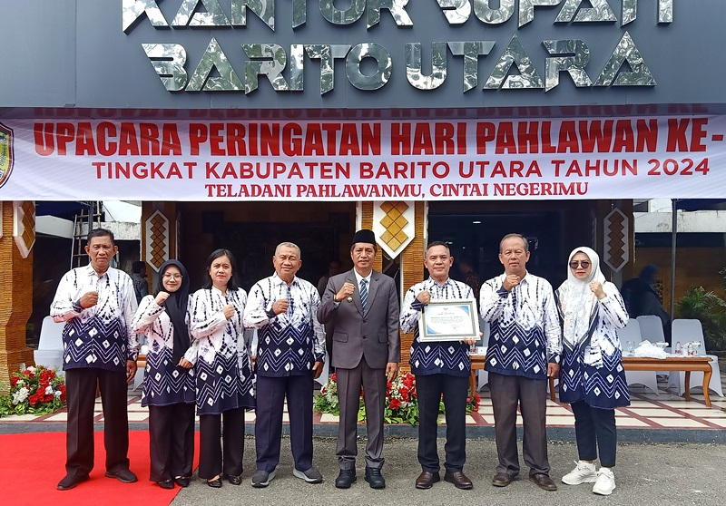 MUARA TEWEH, onlinekoranbarito.com – Usai melaksanakan upacara memperingati Hari Pahlawan 10 November, Pj Buapti Barito Utara Drs Muhlis menyerahkan piagam penghargaan kepada Perusahaan Daerah (Perusda) Batara Membangun, di halaman kantor Bupati, Minggu (10/11/2024).