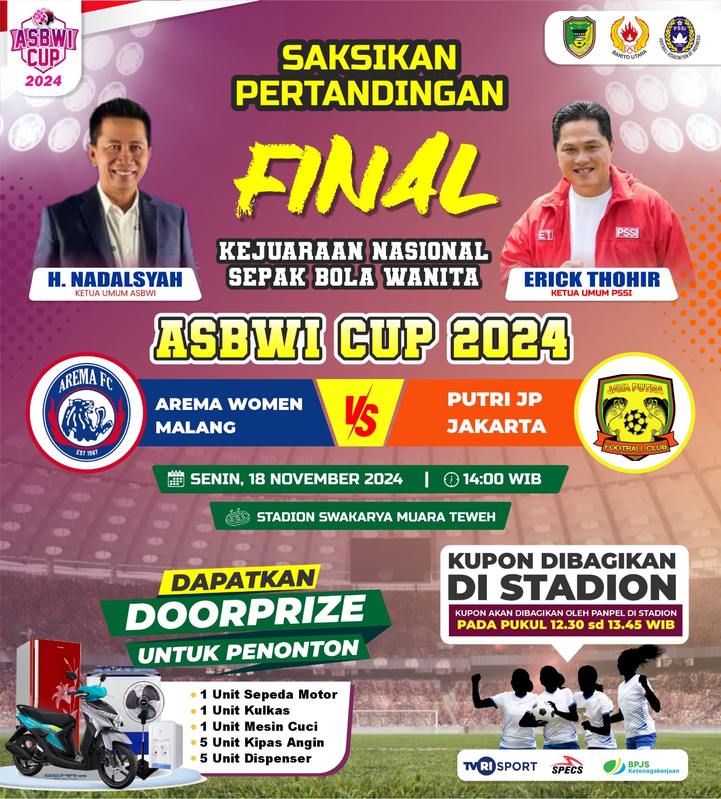 Pada laga final, bagi para penonton yang menyaksikan pertandingan final antara Arema Women Malang vs Putri Jp Jakarta disediakan door prize seperti 1 (satu) unit sepeda motor, 1 (satu) unit Kulkas, 1 (satu) unit mesin cuci, 5 (lima) unit kipas angin dan 5 (lima) unit Dispenser. Kupon akan dibagikan panitia pelaksana pada pukul 12.30 Wib sampai dengan 13.45 WIB. (adv/kb).