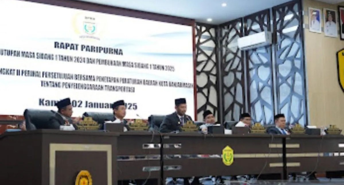 BANJARMASIN, onlinekoranbarito.com – DPRD Kota Banjarmasin, Kalimantan Selatan mengesahkan peraturan daerah (perda) penyelenggaraan transportasi pada pembukaan rapat paripurna dewan tahun 2025. Ketua DPRD Kota Banjarmasin Rikval Fachruri saat memimpin rapat paripurna di Gedung Dewan Kota Banjarmasin, Kamis, (2/1/2025) menyampaikan, agenda rapat paripurna hari ini ada dua, yakni penutupan masa sidang 1 tahun 2024 dan pembukaan masa sidang 1 tahun 2025.