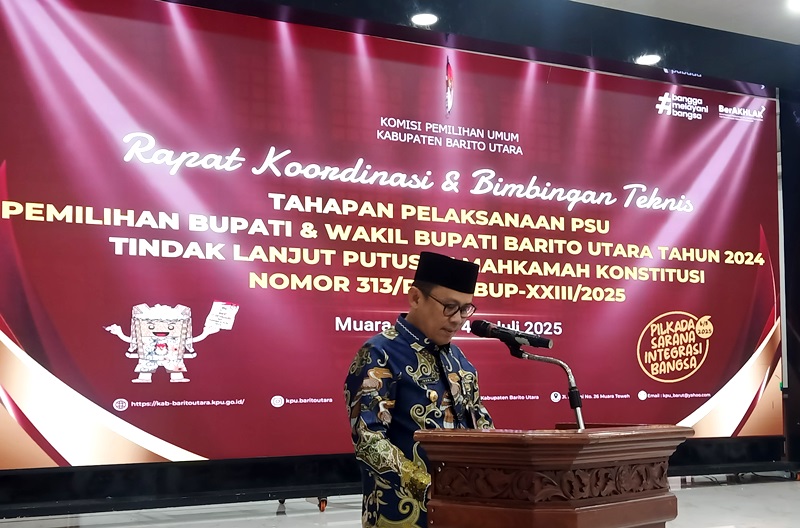 MUARA TEWEH, onlinekoranbarito.com – Pemerintah Kabupaten Barito Utara menggelar Rapat Koordinasi dan Bimbingan Teknis (Bimtek) Tahapan Pelaksanaan Pemungutan Suara Ulang (PSU) Bupati dan Wakil Bupati Barito Utara Tahun 2024, sebagai tindak lanjut dari putusan Mahkamah Konstitusi (MK), bertempat di Gedung Balai Antang, Jumat (4/7/2025).