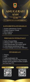 Pendaftaran Anugerah ASN 2025 sendiri dibuka hingga 30 September 2025. Sesuai arahan Gubernur Kalsel, H. Muhidin, dan Sekda Provinsi Kalsel, ASN lingkup Pemprov Kalsel diimbau untuk mendaftarkan diri agar dapat berpartisipasi dalam ajang bergengsi tersebut.