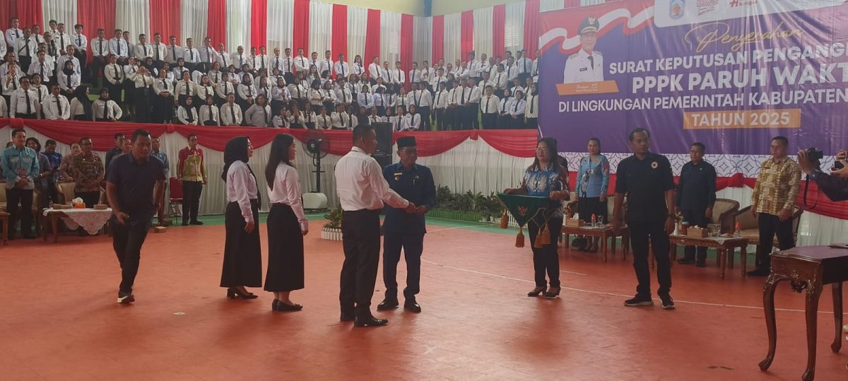 PURUK CAHU, onlinekoranbarito.com – Pemerintah Kabupaten (Pemkab) Murung Raya resmi melantik 1.313 Pegawai Pemerintah dengan Perjanjian Kerja (PPPK) Paruh Waktu formasi tahun berjalan. Pelantikan dan penyerahan Surat Keputusan (SK) dilakukan langsung oleh Bupati Murung Raya, Heriyus, di GOR Tana Malai Tolung Lingu, Kamis (6/11/2025).