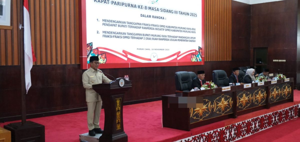 PURUK CAHU, onlinekoranbarito.com – Suasana Rapat Paripurna ke-8 Masa Sidang III DPRD Murung Raya pada Senin (10/11/2025) terasa lebih intens dari biasanya. Di Ruang Rapat Paripurna yang penuh oleh unsur Forkopimda, anggota dewan, para kepala perangkat daerah, serta tokoh masyarakat, Bupati Murung Raya Heriyus tampil menyampaikan jawaban atas pemandangan umum fraksi-fraksi DPRD terhadap dua Rancangan Peraturan Daerah (Raperda) usulan Pemerintah Daerah.