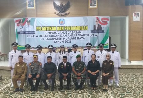 PURUK CAHU, onlinekoranbarito.com – Bupati Kabupaten Murung Raya, Heriyus melaksanakan pelantikan dan pengambilan sumpah jabatan Kepala Desa Pengganti Antar Waktu (PAW), Senin (23/2/2026), di Rumah Jabatan Bupati. Pelantikan ini, turut dihadiri Ketua DPRD Murung Raya, Rumiadi, Penjabat Sekda Murung Raya Sarwo Mintarjo, Kepala Dinas Pemberdayaan Masyarakat dan Desa (PMD), perwakilan Kejaksaan Negeri, Wakapolres Murung Raya, serta para camat.