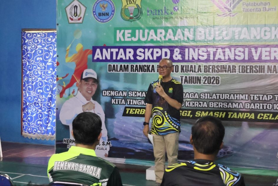 MARABAHAN, onlinekoranbarito.com – Pemerintah Kabupaten Barito Kuala (Batola) menegaskan komitmennya dalam menciptakan lingkungan kerja yang sehat dan bebas narkoba. Dukungan tersebut disampaikan Bupati Batola yang diwakili Sekretaris Daerah (Sekda) Barito Kuala, H. Zulkipli Yadi Noor, saat membuka Kejuaraan Bulutangkis Antar-SKPD dan Instansi Vertikal di Gedung Ije Jela, Selasa (21/4/2026).